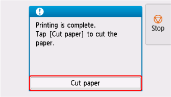 Segure o documento impresso pela borda inferior para evitar que ele caia e selecione Cortar papel (Cut paper) para cortar o papel em rolo.