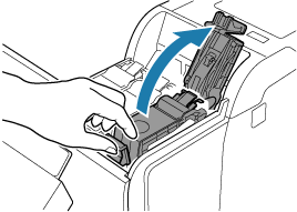 Pressione horizontalmente a ponta da alavanca de bloqueio do cartucho de tinta da cor para substituição e puxe para cima a alavanca de bloqueio do cartucho de tinta para abri-lo.