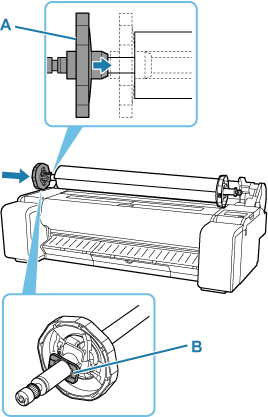 Удерживая фланец держателя рулона (A), сдвиньте держатель вдоль скользящих направляющих (B) с обеих сторон. Установите держатель ровно в отверстие держателя рулона.