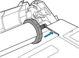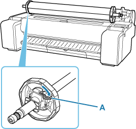 Разместив рулон бумаги ведущим краем вперед, вставьте держатель рулона с правой стороны рулона. Вставьте до конца, пока рулон не коснется фланца (A) держателя рулона.