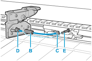 Установите новый нож для обрезки, выровняв B с C и D с E.