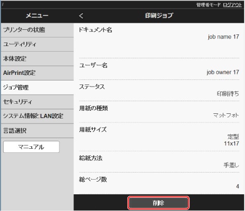 • ジョブ管理]から[印刷ジョブをすべて削除]を選ぶと、ジョブキューの印刷ジョブをすべて削除できます。