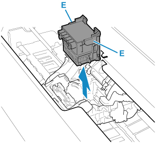 8. 손잡이(E)를 잡고 프린트 헤드를 제거한 다음 OK를 탭합니다.
