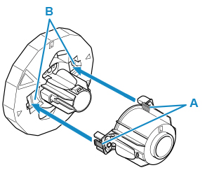 3インチ紙管の用紙を使用する場合は、3インチ紙管アタッチメントのツメ(A)をロールホルダーの穴(B)に合わせて、しっかりと差し込む