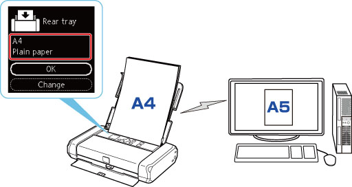 - De exemplu, atunci când setarea pentru hârtie pentru imprimare este A5 şi informaţiile despre hârtie înregistrate în imprimantă indică dimensiunea A4, imprimanta începe imprimarea pe hârtia încărcată în tava din spate, fără a schimba setarea pentru dimensiunea hârtiei pentru imprimare.