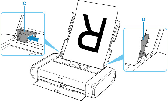 Glisaţi ghidajul pentru hârtie (C) spre stânga şi încărcaţi hârtia în extrema dreaptă (D) a tăvii din spate CU FAŢA DE IMPRIMARE ORIENTATĂ SPRE DUMNEAVOASTRĂ.