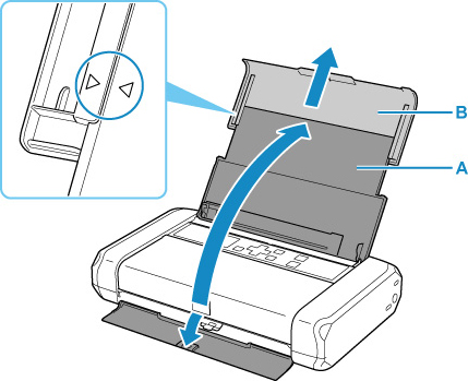 3. Izvlecite oporo za papir (B), tako da je oznaka s puščico () poravnana z oznako s puščico ().