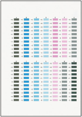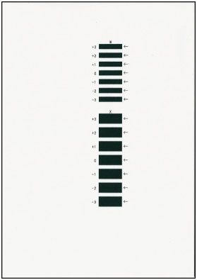 Zkontrolujte první vzorek. Ve sloupci A vyhledejte vzorek, ve kterém jsou pruhy nejméně vidět, vyberte číslo daného vzorku a stiskněte tlačítko OK.