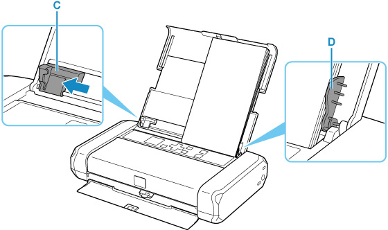 Glisaţi ghidajul pentru hârtie (C) spre stânga şi încărcaţi plicurile în extrema dreaptă (D) a tăvii din spate CU FAŢA DE IMPRIMARE ORIENTATĂ SPRE DUMNEAVOASTRĂ.
