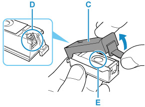 Ne dodirujte zaštitnu kapicu (C) iznutra ili otvoreni ulaz za tintu (E). Tinta vam može ostaviti mrlje na rukama ako ih dotaknete.