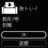 封筒をセットすると、液晶モニターに後トレイの用紙の設定を確認する画面が表示されます。