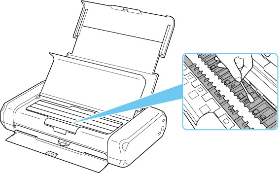 Dacă problema nu se rezolvă după ce efectuaţi din nou curăţarea, este posibil ca ieşiturile din interiorul imprimantei să fie pătate. Ştergeţi cerneala de pe ieşituri utilizând un tampon de bumbac sau ceva asemănător.