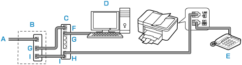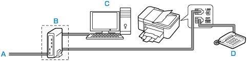 • B: xDSL-modem (splitter er muligvis ikke indbygget i modemmet)