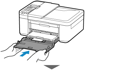 7. Hold på højre og venstre side på frontdækslet, og skub kassetten tilbage, indtil pilen () på frontdækslet flugter med kanten på printeren.