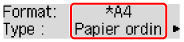 Une fois que vous avez poussé la cassette vers l'arrière, l'écran d'enregistrement des informations sur le papier s'affiche sur l'écran LCD. Sélectionnez A4 ou Lettre pour Format: et Papier ordin pour Type :, puis appuyez sur le bouton OK.