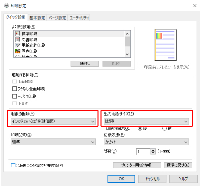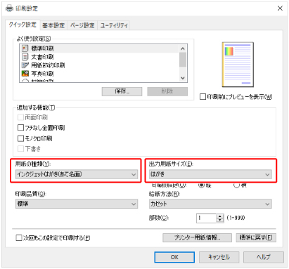 [用紙の種類]で[インクジェットはがき(通信面)]、[出力用紙サイズ]で[はがき]を選ぶ