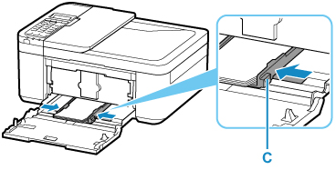 Skjut den högra pappersledaren (C) för att justera pappersledarna mot pappersbuntens båda sidor.