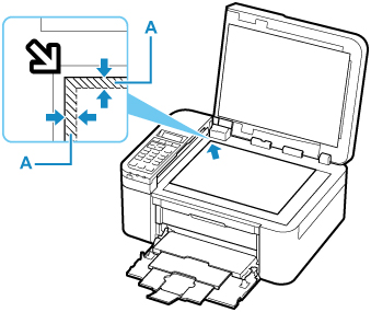 Đặt bản gốc VỚI MẶT CẦN QUÉT ÚP XUỐNG, để khoảng trống từ 1 cm (0,40 inch) trở lên giữa các cạnh (vùng gạch chéo) của màn quét. Máy không thể quét các phần đặt trên vùng gạch chéo.