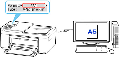 - Par exemple, si le paramètre de format de papier pour l'impression ou la copie est A5 et que l'information sur le papier enregistrée dans l'imprimante est A4, l'imprimante démarre l'impression ou la copie sur le papier chargé dans le réceptacle avant sans modifier le paramètre de format du papier pour l'impression ou la copie.