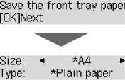 - Če je na primer papir za tiskanje/kopiranje nastavljen na A5, podatki o papirju, registrirani za tiskalnik, pa so za A4, tiskalnik začne tiskati/kopirati na papir, ki je naložen v sprednji pladenj brez spreminjanja nastavitve velikosti papirja za tiskanje/kopiranje.