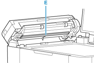 ADF'nin cam yüzeyini (D) ve belge besleyici kapağının iç tarafını (E) yavaşça silin.