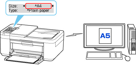 - Na primjer, kada je postavka veličine papira za ispis/kopiranje A5, a informacije o papiru registrirane u pisaču navode A4, prije započinjanja ispisa/kopiranja umetnite papir veličine A5 u prednju ladicu.