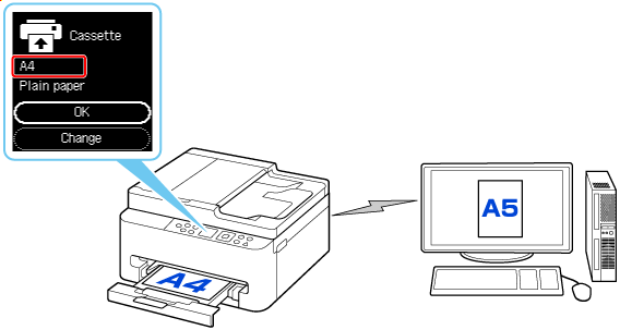 Pokud je například pro tisk/kopírování zvolené nastavení velikosti papíru A5 a v tiskárně je registrovaná velikost papíru A4, tiskárna začne tisknout/kopírovat na papír vložený v kazetě beze změny nastavení velikosti papíru pro tisk/kopírování.