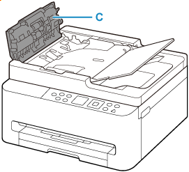 Z notranjosti pokrova podajalnika dokumentov (C) obrišite papirni prah s pripravljeno suho krpo.