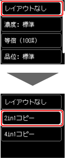コピー待機画面でOKボタンを押して印刷設定画面を表示し、[その他]からレイアウトで[2in1コピー]を選びます。