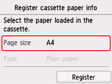 V nabídce Vel. str. (Page size) vyberte velikost papíru vloženého v kazetě a vyberte možnost Registrovat (Register).