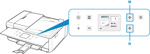 Ověřte nastavení papíru a stiskněte tlačítko Černý (Black) (M) nebo Barevný (Color) (N).
