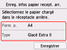 Une fois que vous avez fermé le couvercle de la fente d'alimentation, l'écran d'enregistrement des informations sur le papier pour le réceptacle arrière s'affiche sur l'écran tactile.