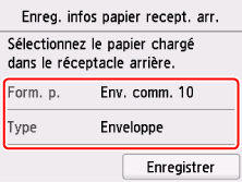 Sélectionnez la taille et le type des enveloppes chargées dans le réceptacle arrière dans Form. p. et Type, puis sélectionnez Enregistrer.