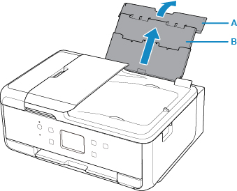 Öppna bakre fackets lock (A) och dra sedan upp pappersstödet (B).
