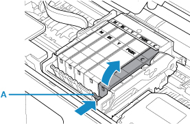 Tryck på fliken (A) och lyft ut bläckbehållaren.