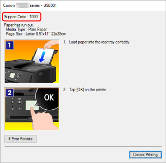 Ако възникне грешка при печатане, например хартията свърши или заседне, на компютърния екран и на сензорния екран се показва съобщение за грешка.