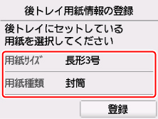 後トレイにセットした封筒に合わせて[用紙サイズ]を設定し、[用紙種類]で[封筒]を選んで[登録]を選ぶ