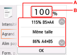 Paramètre dans Agrand. : 70 % A4->A5/86 % A4->B5/94 % A4->LTR/115 % B5->A4/141 % A5->A4/156 % 5x7->LTR/183 % 4x6->LTR