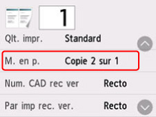 Sélectionnez Paramètres dans l'écran d'attente de copie pour afficher l'écran des paramètres d'impression, sélectionnez Copie 2 sur 1 pour M. en p., puis OK.