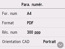 Lorsque l'écran d'attente de numérisation s'affiche, sélectionnez Para. numér. pour sélectionner le paramètre. Faites défiler pour afficher les paramètres de configuration et sélectionnez le paramètre pour afficher ses options. Sélectionnez pour spécifier le paramètre.