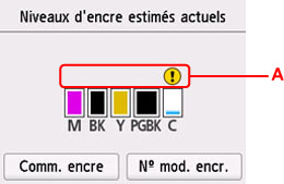 Niveaux d'encre estimés.Un symbole s'affiche dans la zone A en cas d'informations sur le niveau d'encre restant.