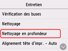 Si le nettoyage standard de la tête d'impression ne permet pas d'améliorer la qualité d'impression, procédez à un nettoyage en profondeur de la tête d'impression. Le nettoyage en profondeur de la tête d'impression requiert une plus grande quantité d'encre qu'un nettoyage normal de la tête d'impression : vous ne devez donc nettoyer la tête d'impression qu'en cas d'absolue nécessité.