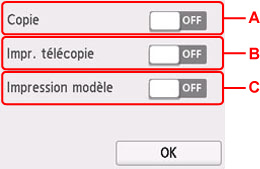 B: Sélectionnez l'impression recto/verso par défaut des fax envoyés/reçus, des rapports ou des listes.