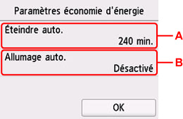 B : Si vous sélectionnez Activé, l'imprimante est automatiquement mise sous tension lorsqu'une commande de numérisation d'un ordinateur ou des données d'impression sont envoyées à l'imprimante.
