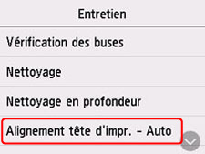 Pour imprimer et vérifier les valeurs de réglage actuelles de la position de la tête d'impression, sélectionnez Impr. valeur d'align. des têtes sur l'écran Entretien.