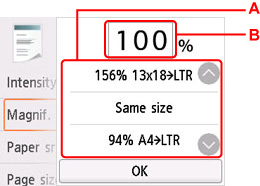 Kui valite kopeerimise ooterežiimi kuval suvandi Määrangud (Settings) ja vähenduse/suurenduse meetodi valimiseks suvandi Suurend. (Magnif.), avatakse allolev kuva. Määrake suurendus ja valige OK.