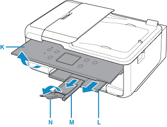 11. Deschideţi panoul de operare (K), trageţi tava de ieşire a hârtiei (L) şi suportul de ieşire a hârtiei (M) şi deschideţi extensia tăvii de ieşire (N).