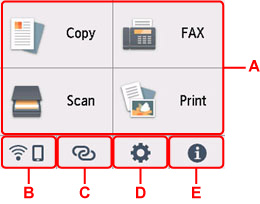Atingeţi cu vârful degetului ecranul ACASĂ de pe ecranul senzitiv, pentru a selecta meniuri cu funcţii de copiere, scanare etc.