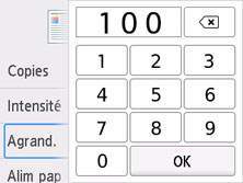 L'écran ci-dessous s'affiche lorsque vous sélectionnez Paramètres sur l'écran d'attente de copie, puis Agrand. pour sélectionner la méthode de réduction ou d'agrandissement. Spécifiez l'agrandissement et sélectionnez OK.