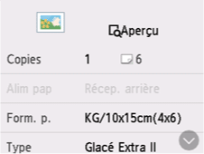 En sélectionnant Aperçu, vous pouvez afficher un aperçu de l'impression dans l'écran d'aperçu. Faites défiler la photo pour changer l'affichage.
